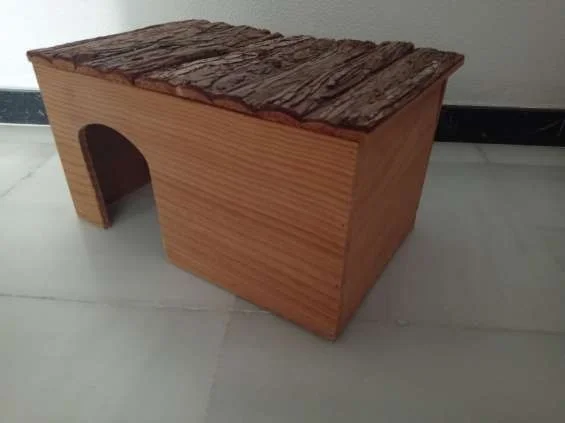 Casa de madera estilo cabaña, con 2 puertas, y ventanita Artesanía 43 ancho x 23 fondo x 28 alto. nido pequeñas mascotas cobayas, degús, jerbos,... Refugio donde comer, descansar, y que les proporciona la necesidad que sienten de sentirse protegidas.